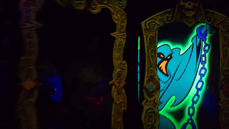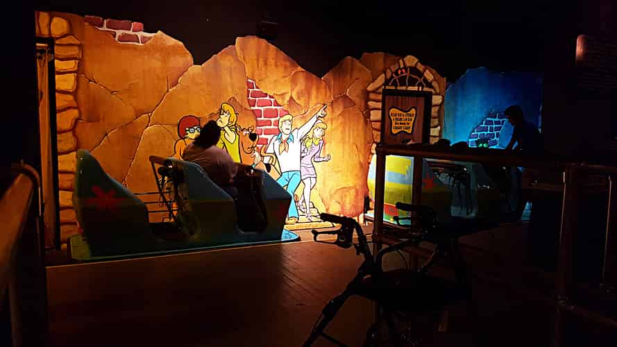 Eventually you board a mystery machine which moves slowly through the ride.