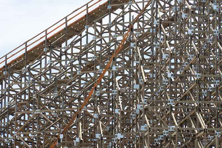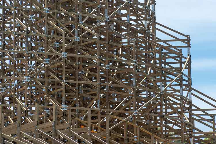 The twisted mess of wood and steel is coming together to form a roller coaster. Somehow... but it is.