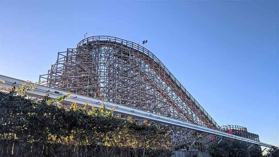 Here you can see just how low set most of the layout is compared to the size of the first drop. Riders can be assured a fast paced ride from start to finish and a constant sense of speed with the wooden structure flying past around them.