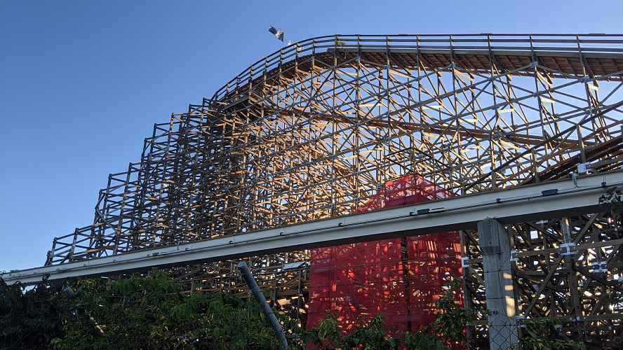 The sweeping lattice of wood that supports the towering first drop.