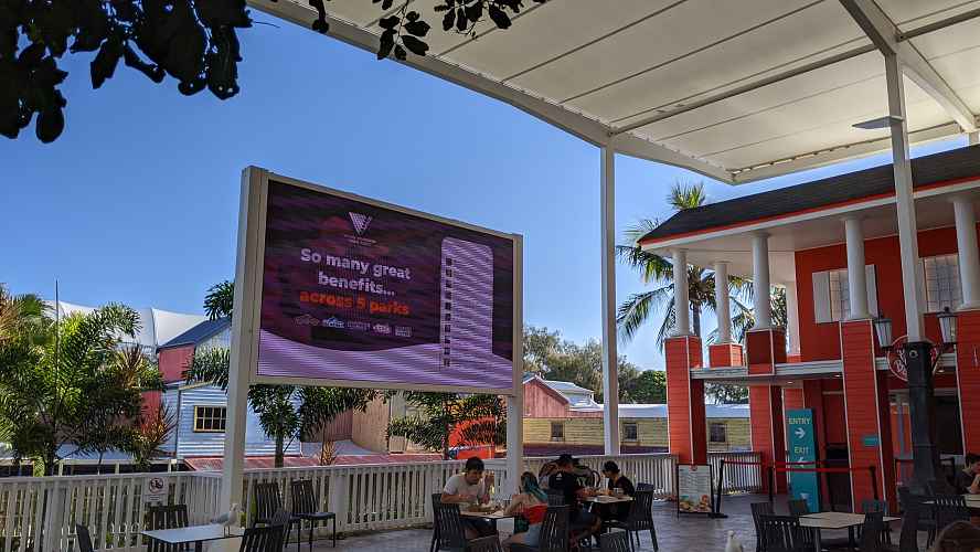 A new big screen in the Plaza area. Because this area doesn't get used for many live shows, nor is there a collection of Warner Bros. cartoons to lean on here, it ends up showing advertising most of the time.