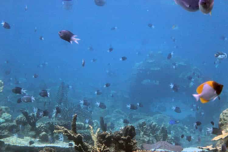 The reef lagoon seems to have become dominated by the black-and-white Bicolor chromis.
