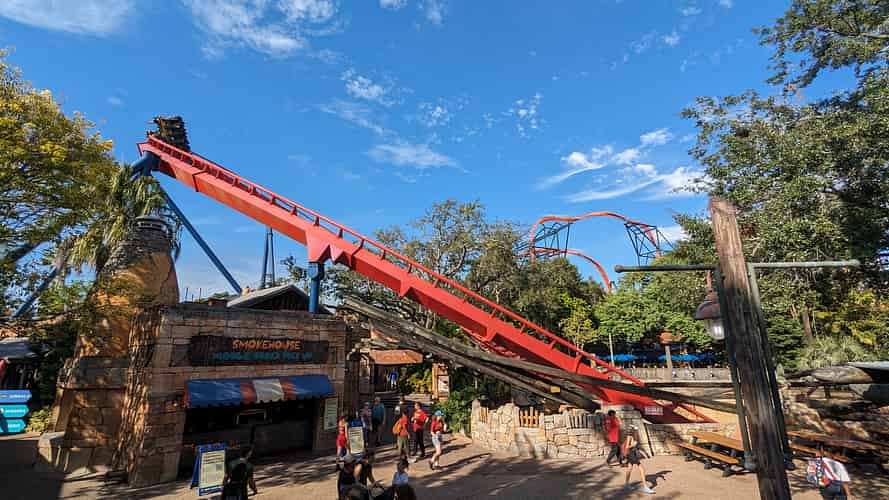 SheiKra starts off with a bang. Trains of 24 riders are held at the top of a 61m drop for a few seconds, before hurtling down.