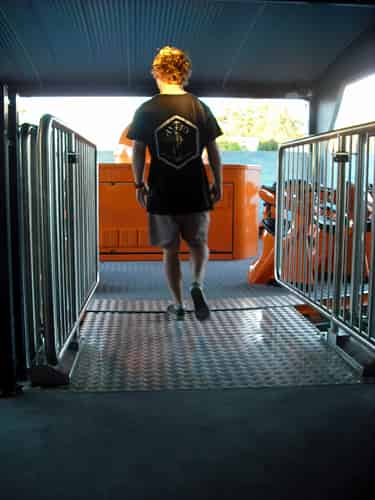 You get on and off the disk via this nifty little bridge with swing out railings and a swing up floor.