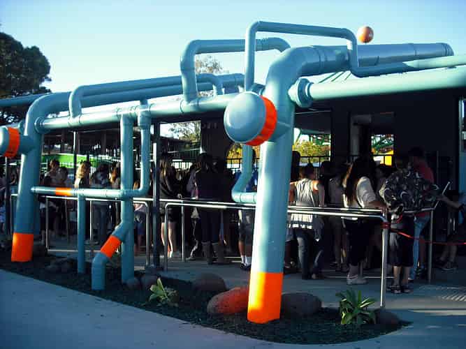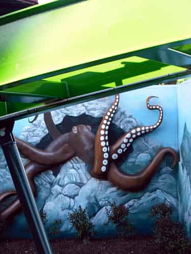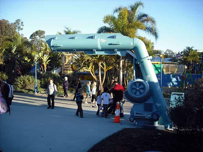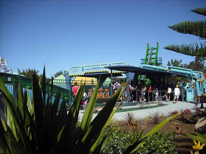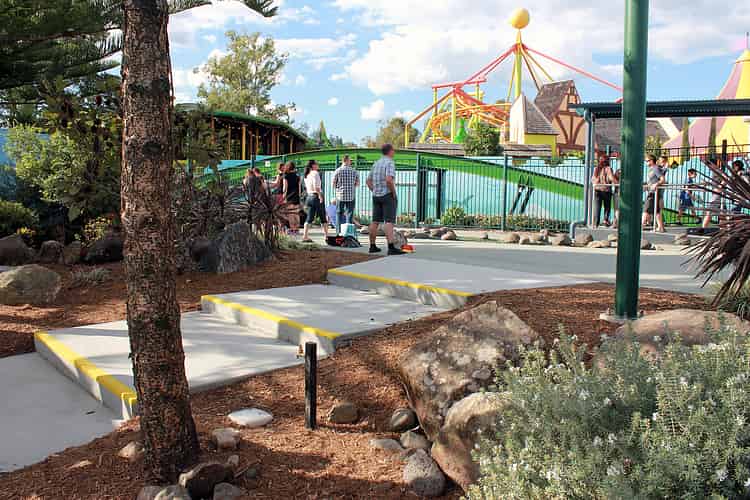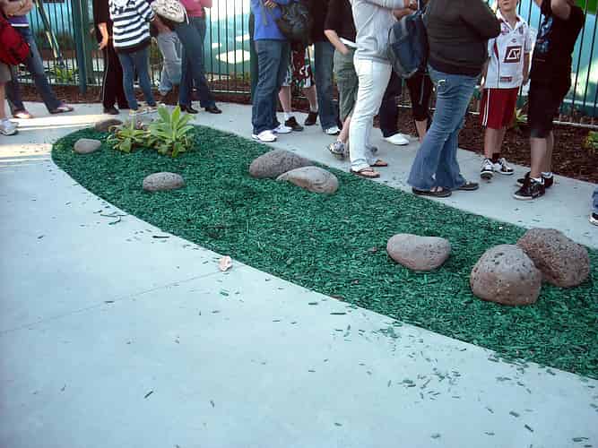 The blurb on www.dreamworld.com.au reads: Travel through an undersea world to reach a hydro energy plant, the docking station for a deep sea discovery vessel. We're guessing this garden with aqua coloured bark chips is the undersea world.