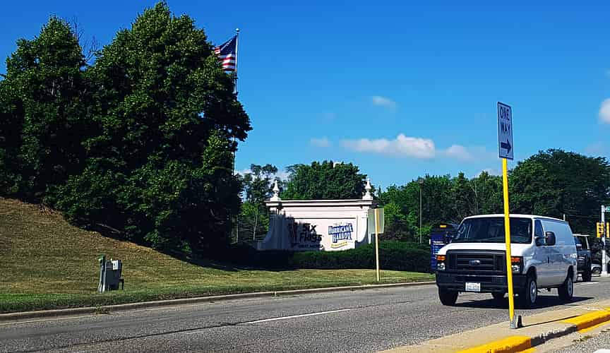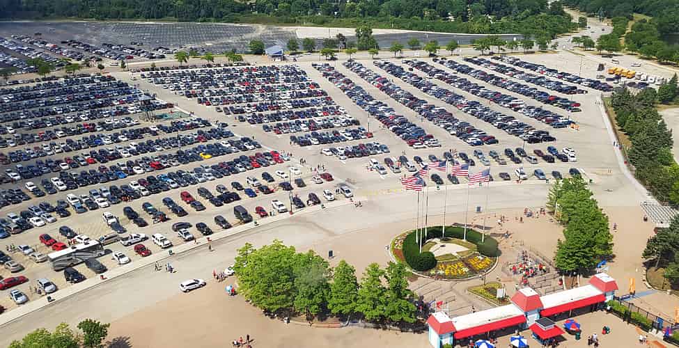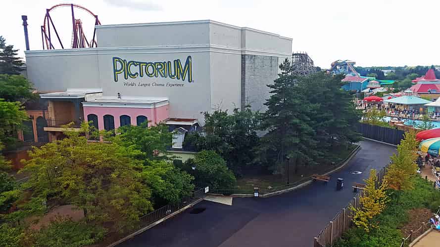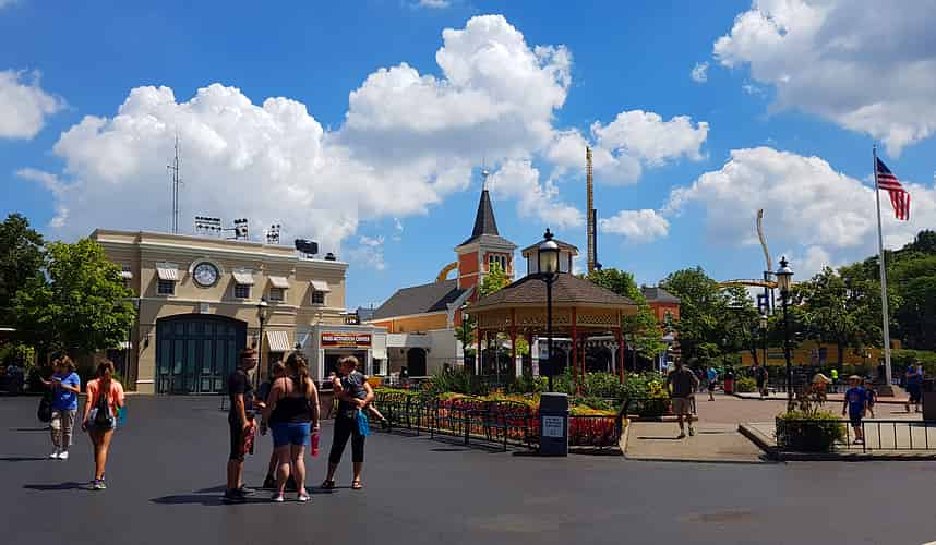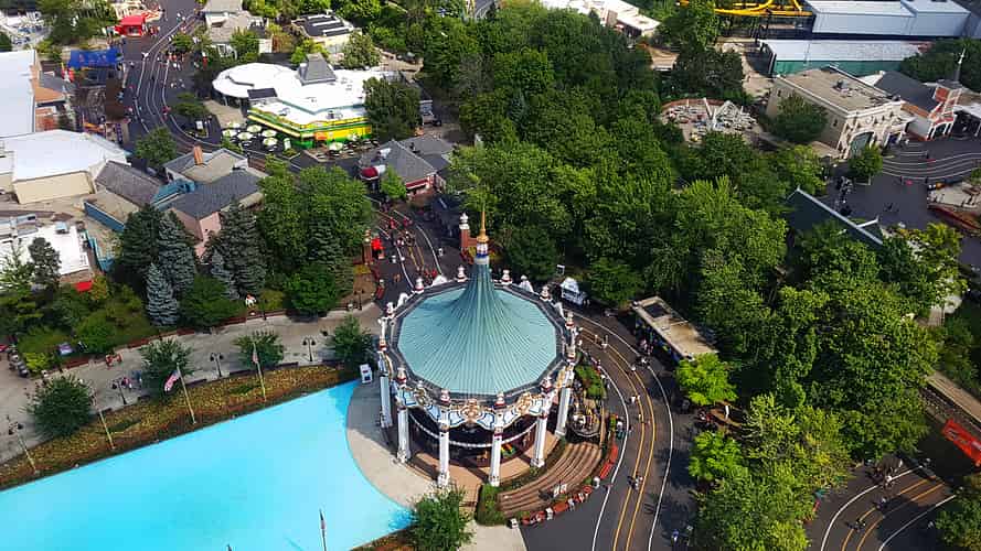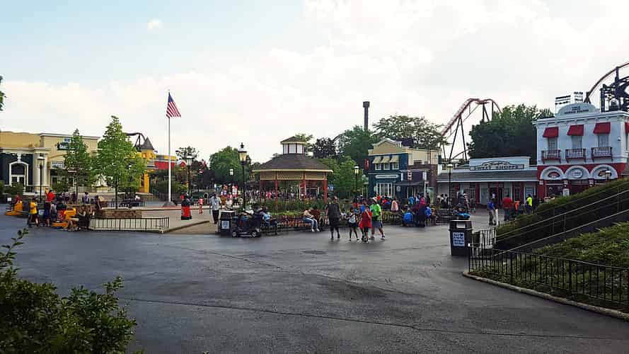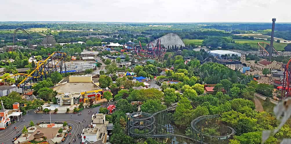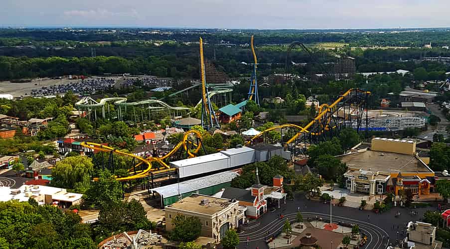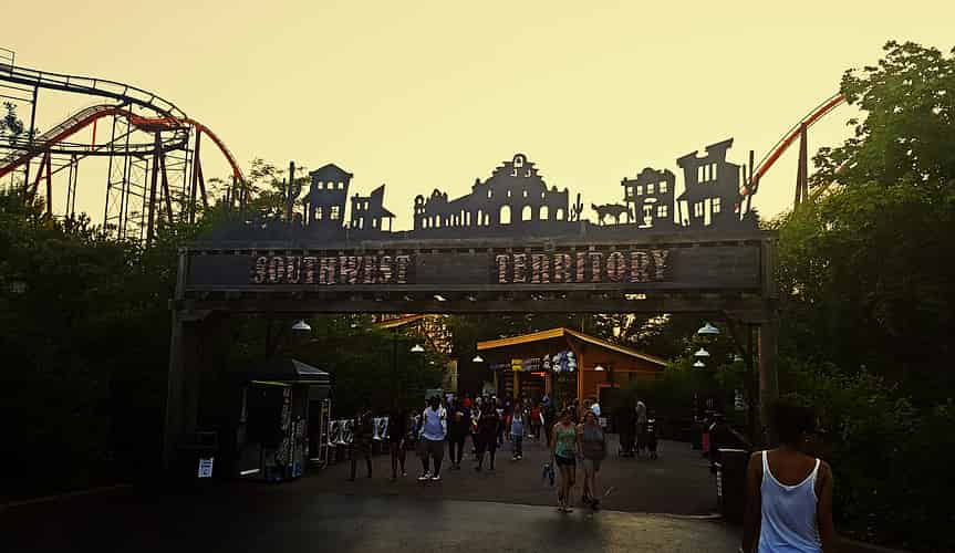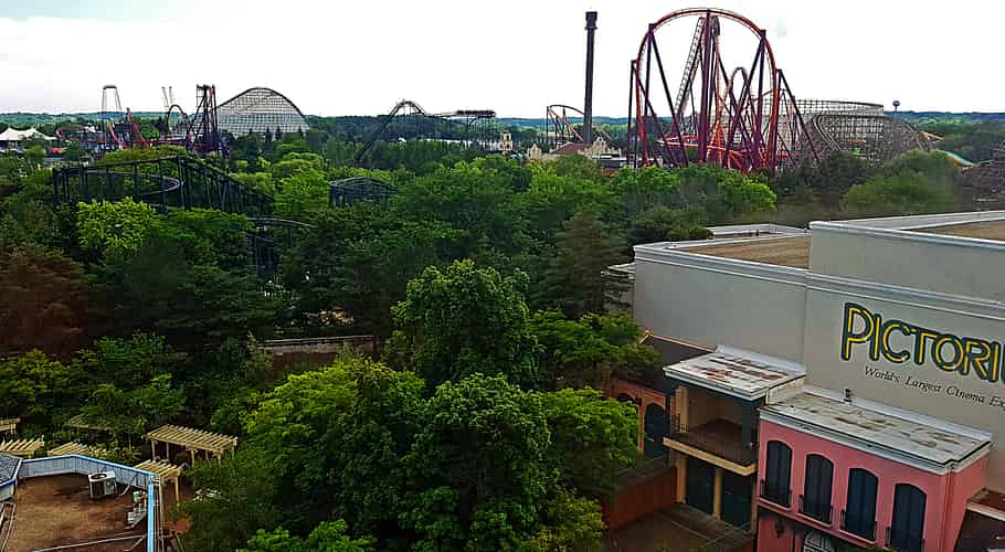 The literal Southwestern end of the park including Giant Drop, Raging Bull, Viper and the Scenic Railway. American eagle is in the distance.