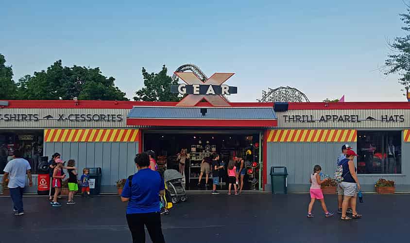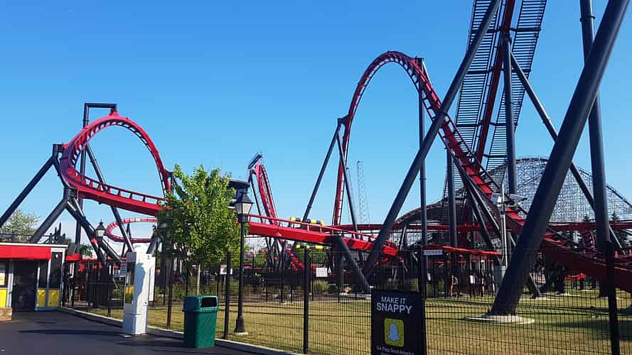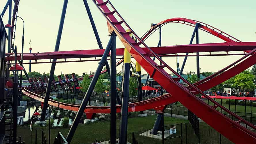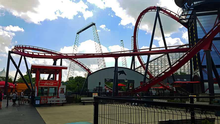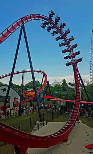 The first drop is a "dive drop" where the train twists upside down slowly before diving down a half loop.