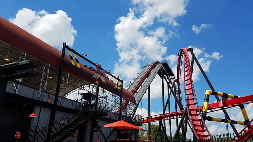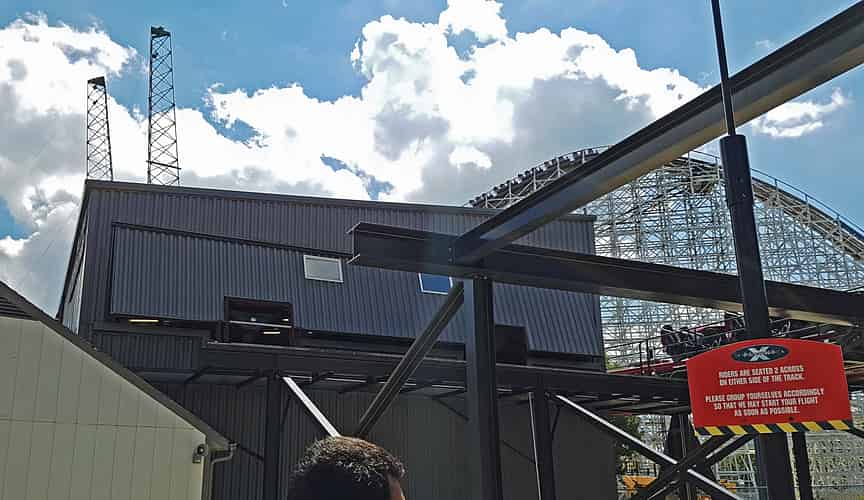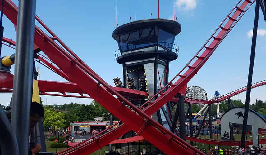 The final inversion is the signature one, where it completes an inline twist through a narrow slot in a control tower.