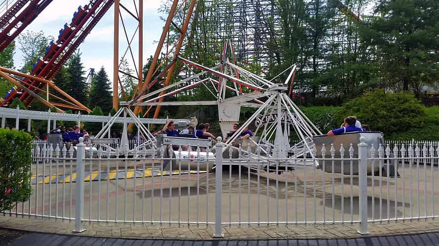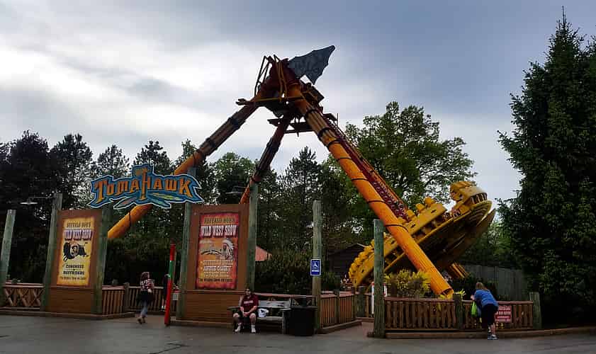 Tomahawk is a Huss Frisbee, where guests sit facing inwards on a spinning platform that swings on a pendulum.