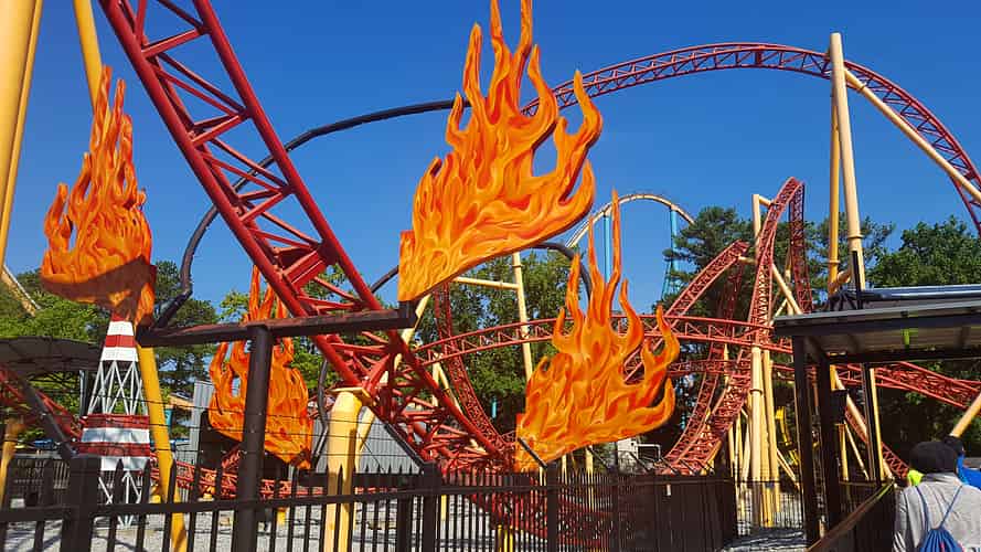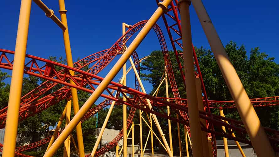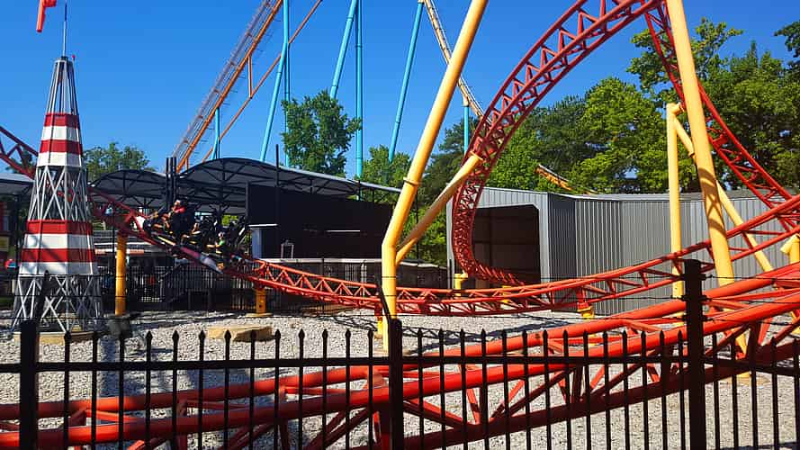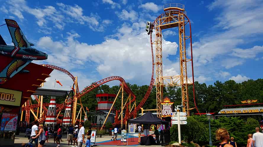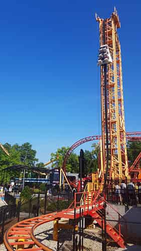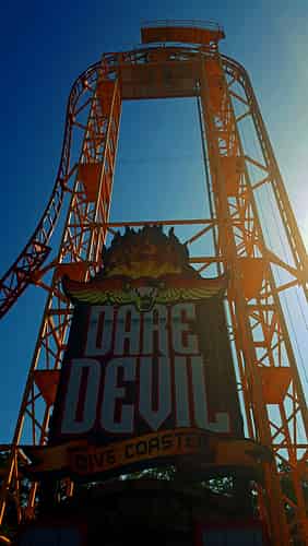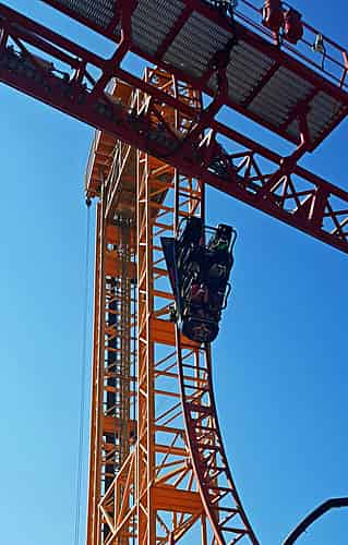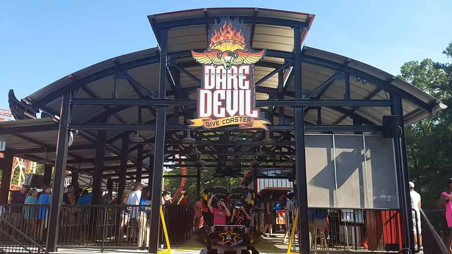 Dare Devil Dive is a compact looping coaster, featuring a beyond vertical 95° drop.
