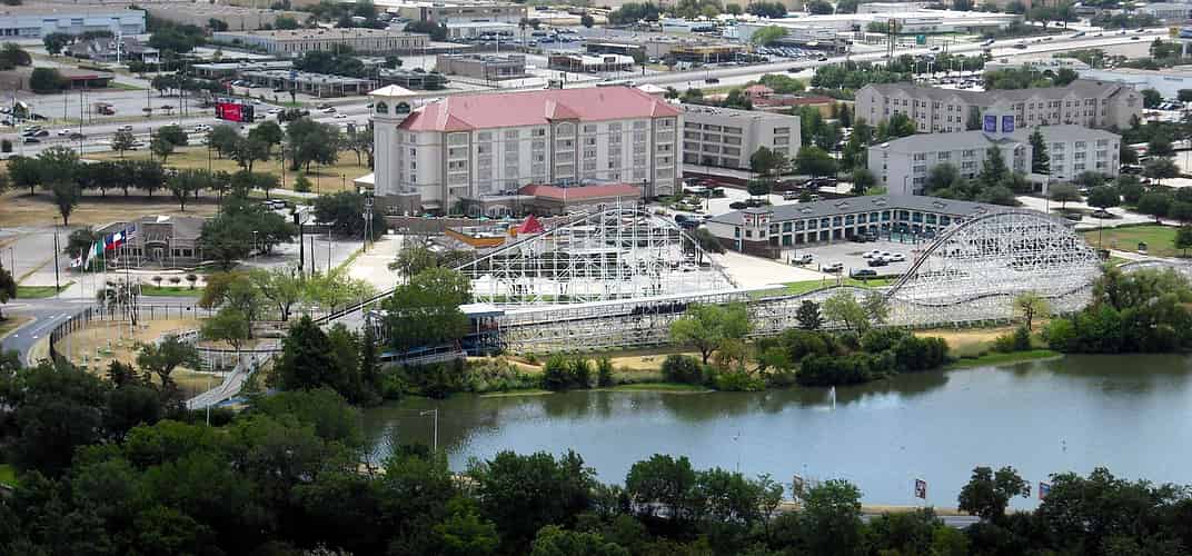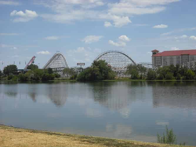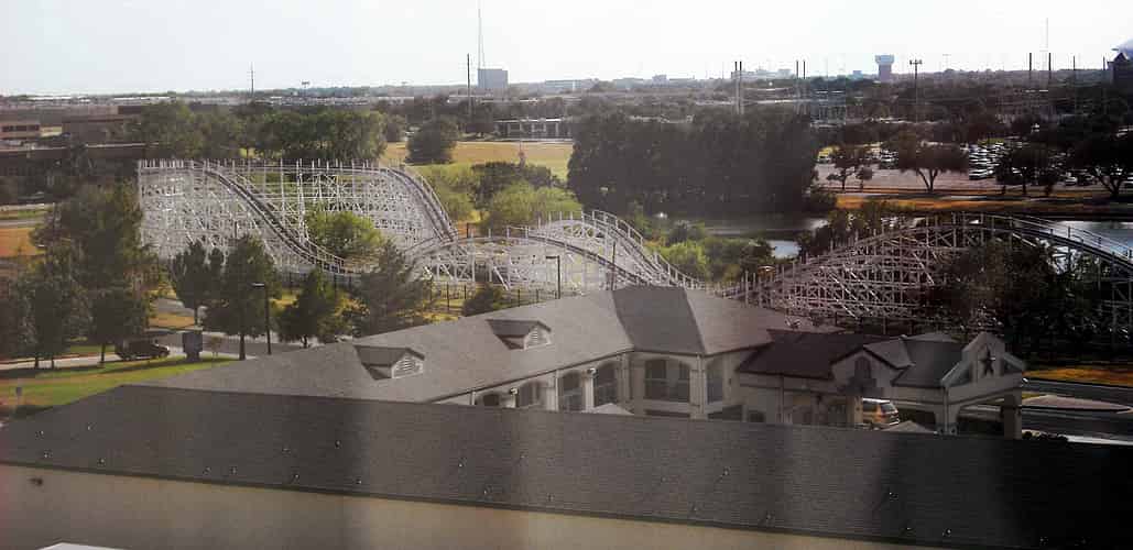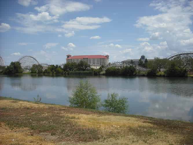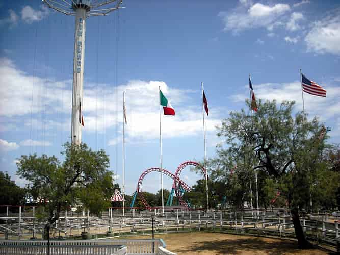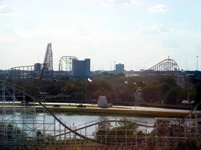 The six flags which started it all and gave the park its name. The flags represent the six nations that have governed Texas. From left to right: Spain, France, Mexico, Republic of Texas, Confederate states of America, and finally the USA.