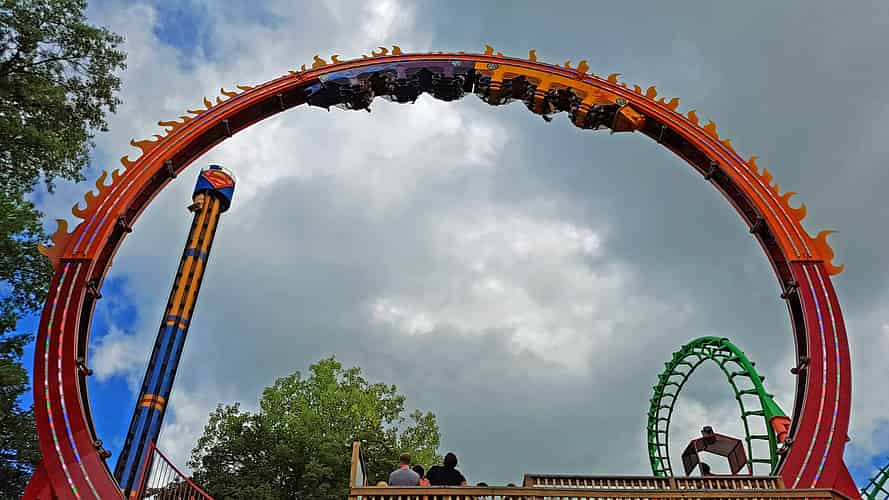 Superman Tower of Power features multiple tracks that drop four seater gondolas down from a height of 70m. A magnetic braking system brings them to a smooth stop meters from hitting the ground.