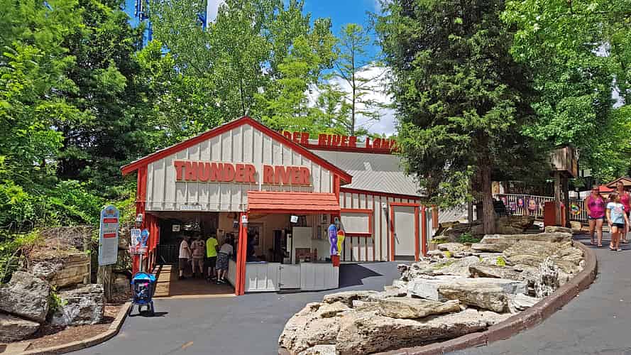 The island of land in the middle of Thunder River contains the Mr. Freeze coaster.