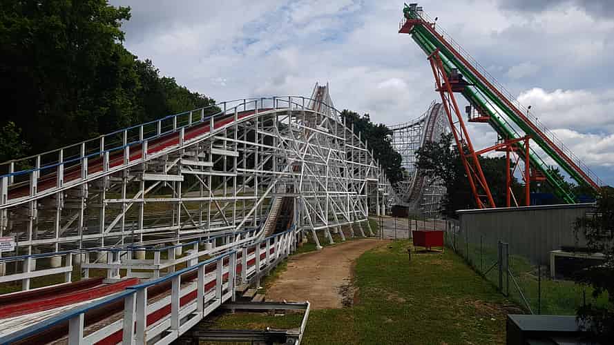 The station building. Previously a mirror image of this track operated on the right side, but was removed and relocated to Dollywood where it operated for some years before being moved a second time to Magic Springs.