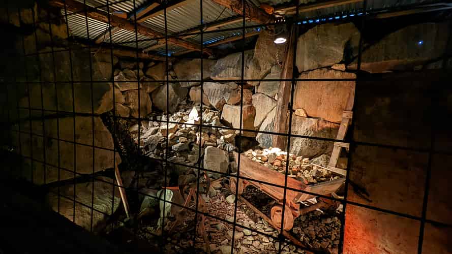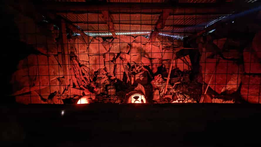 The queue line runs in a tunnel under the coaster, and of course it is themed like a mine.