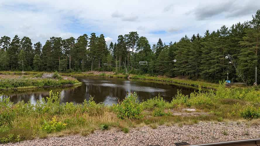 A moving cable runs around the outside of a lake, with guests able to grab onto a rope that is attached to the moving cable, towing them along.