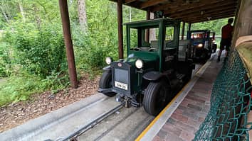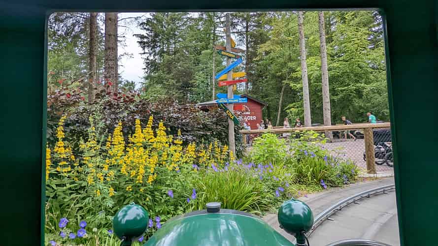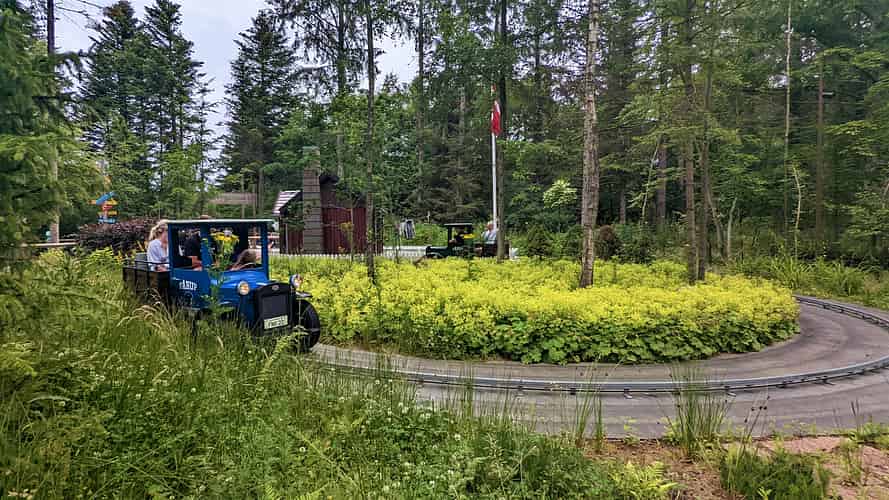 The ride is themed with logging trucks to fit in with the adjacent Saven roller coaster.