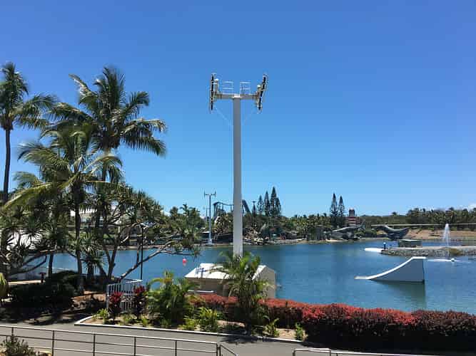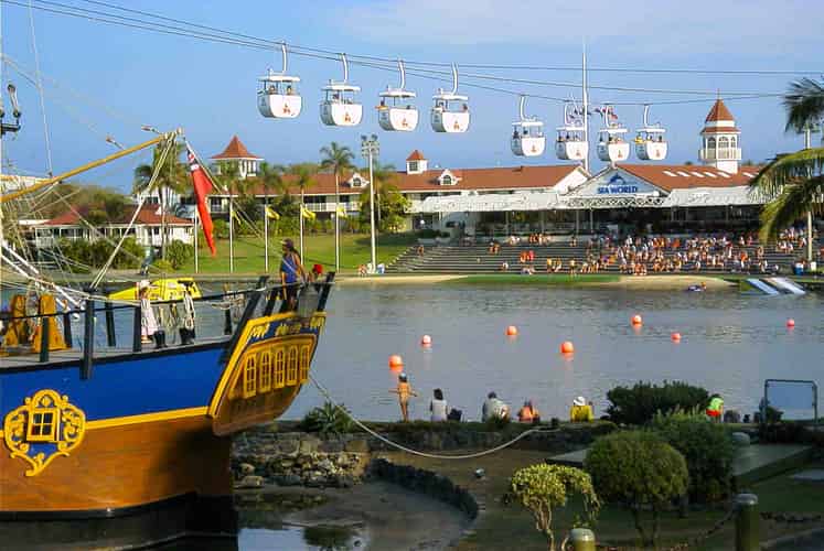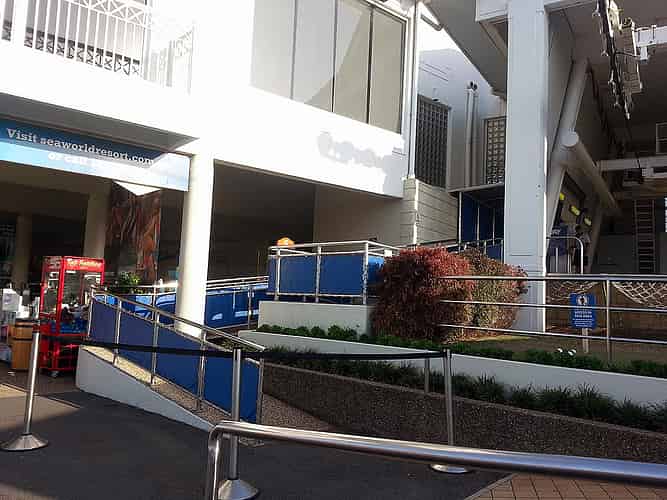 A look over the Endeavour replica and the main entrance to Sea World.