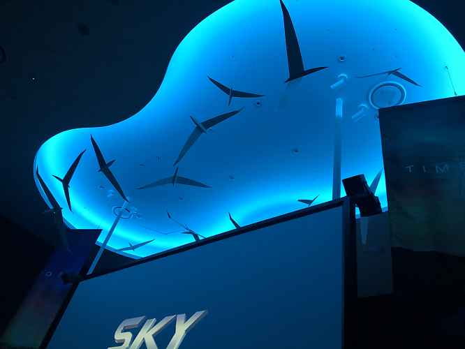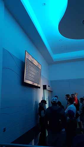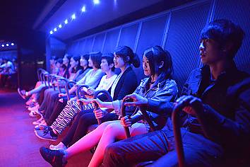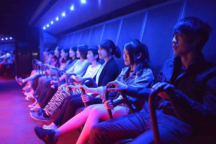 Inside the ride area. Long rows of seats face out into a void with a giant screen.