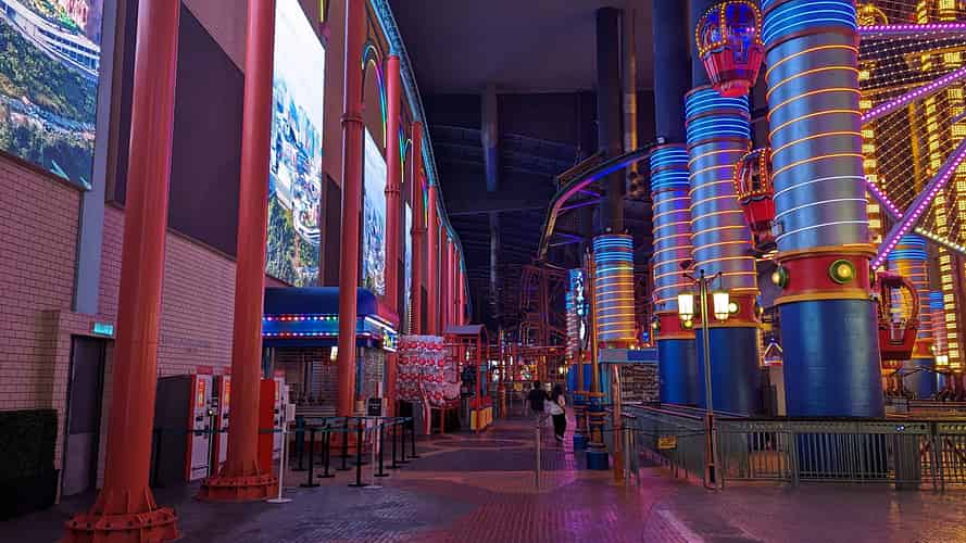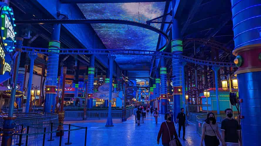 The central walkway has a large screen above it. It's reminiscent of Fremont street in Las Vegas .