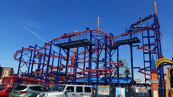 Some of the bigger rides at Luna Park, including Steeplechase, Soarin' Eagle, Zenobio Sling Shot, Thunderbolt, and Parachute Jump.
