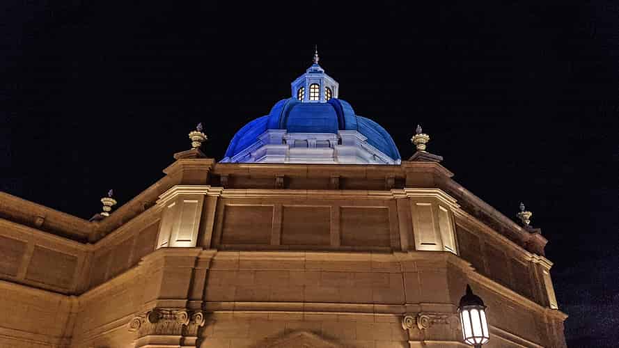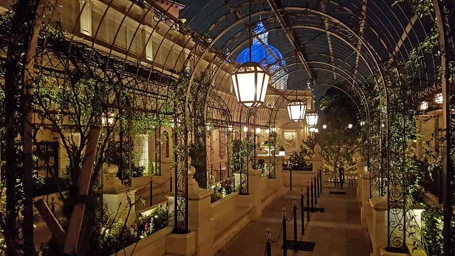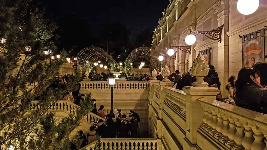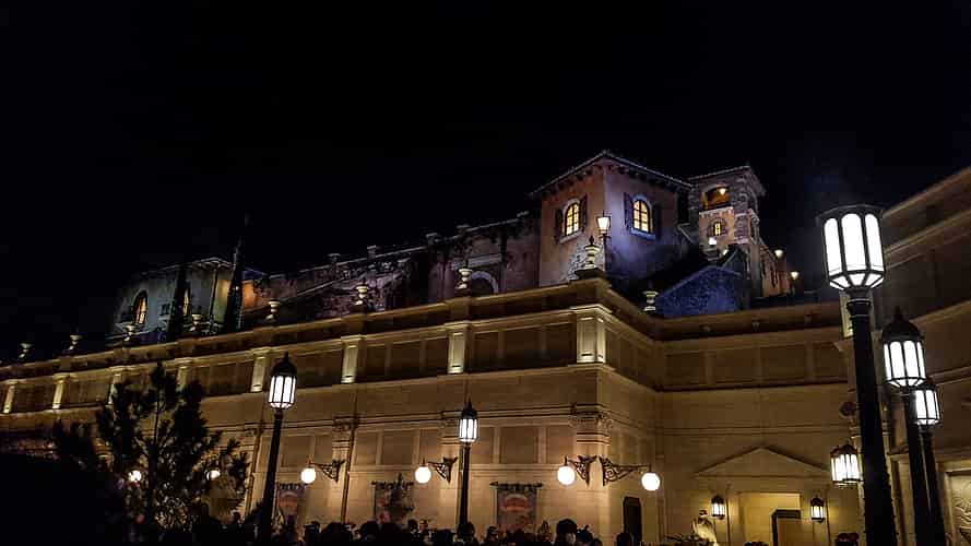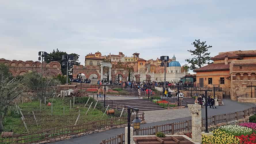 Forced perspective gives the sense of an Italian village rising up behind the ride building.