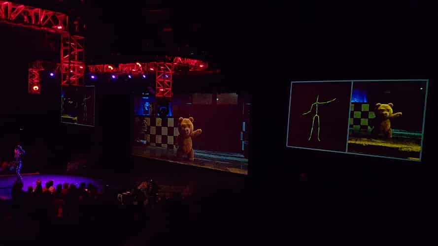 Motion Capture uses cameras coupled with a special suit with optical targets to translate realistic human movement to an animated character....Ted in this case.