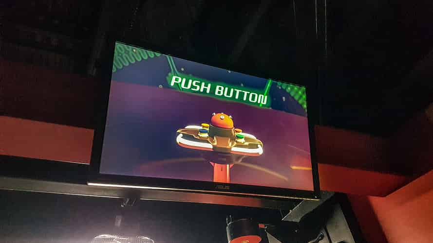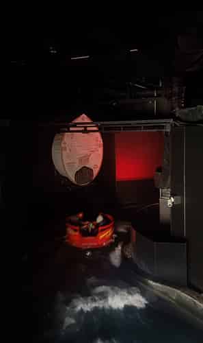 The ride is interactive, with occasional sections where the raft is stopped, with a game or animations on circular screens on the ceiling above (Giving the impression you are sitting in a cup of noodles with characters peering in)