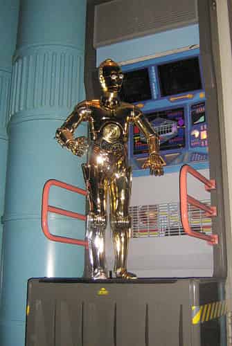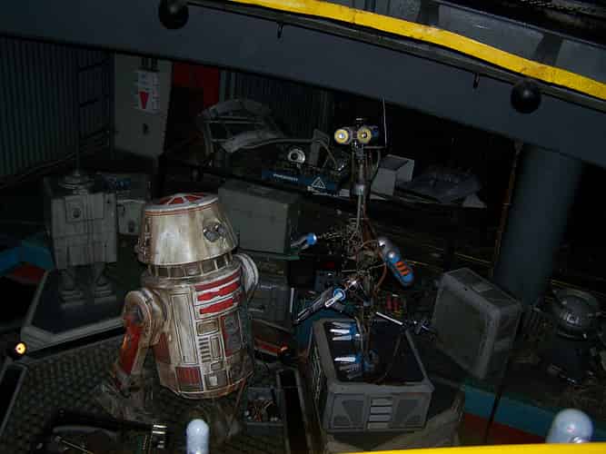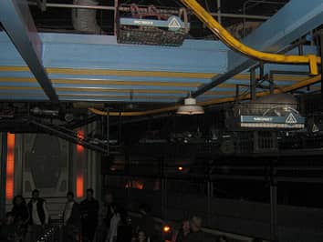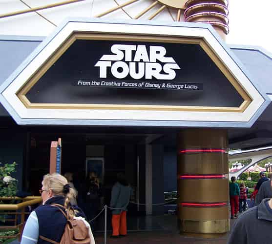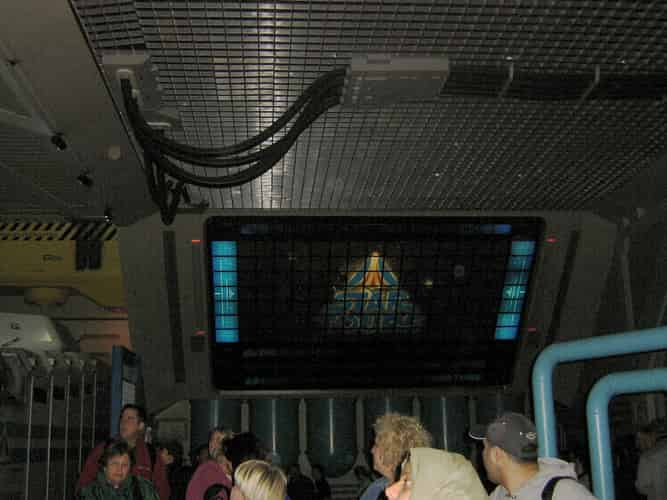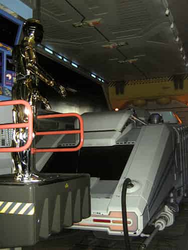 A damaged StarSpeeder 3000 craft is positioned in the queue. The ride itself takes place in a simulator pod themed to the same type of craft.