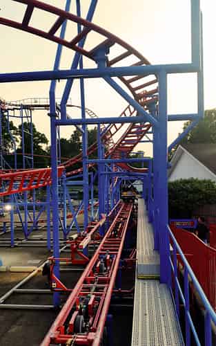 The ride starts off with a curving first drop.
