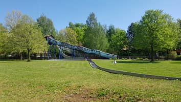 The Sommer Rodelbahn snaking down the hill, with the Steilrutsche Doppelwellenrutsche slides in the background.