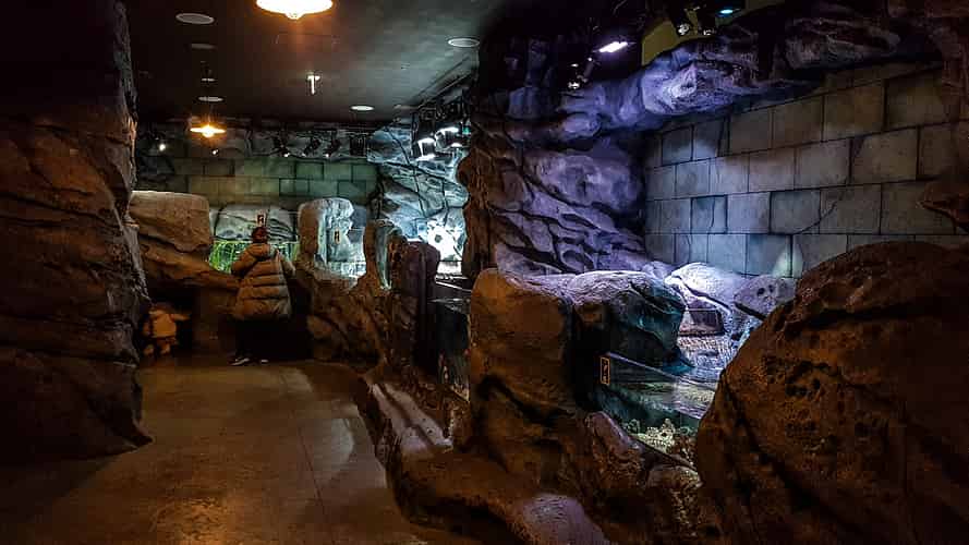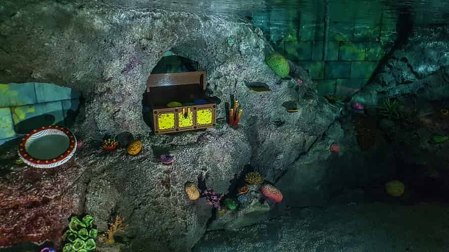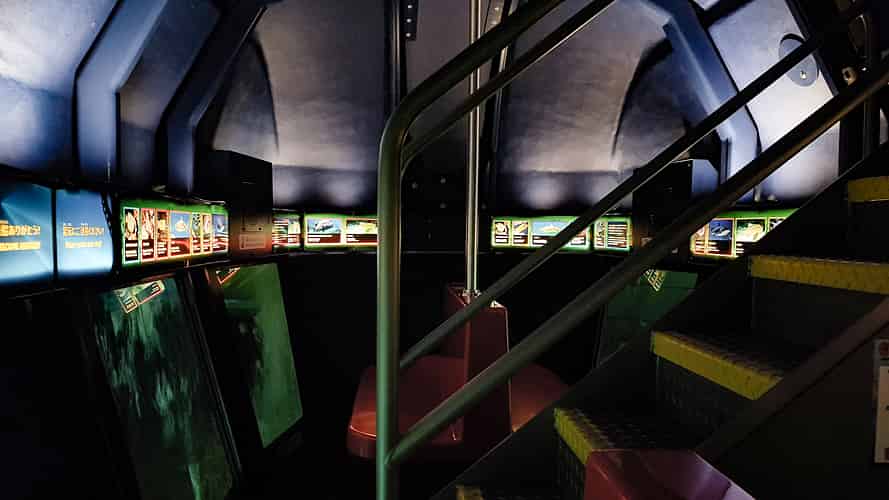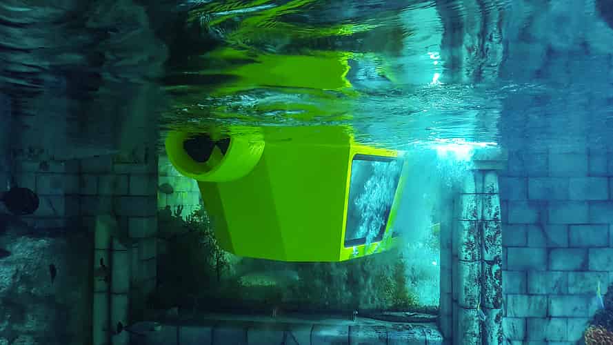 The submarines are suspended from a monorail track and are propelled around the aquarium.