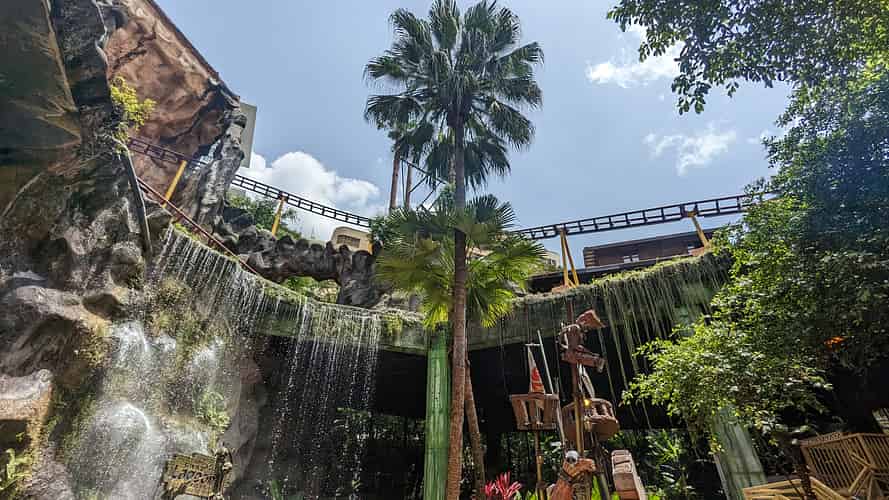 The whole ride is built on an elevated platform above other attractions and restaurants.