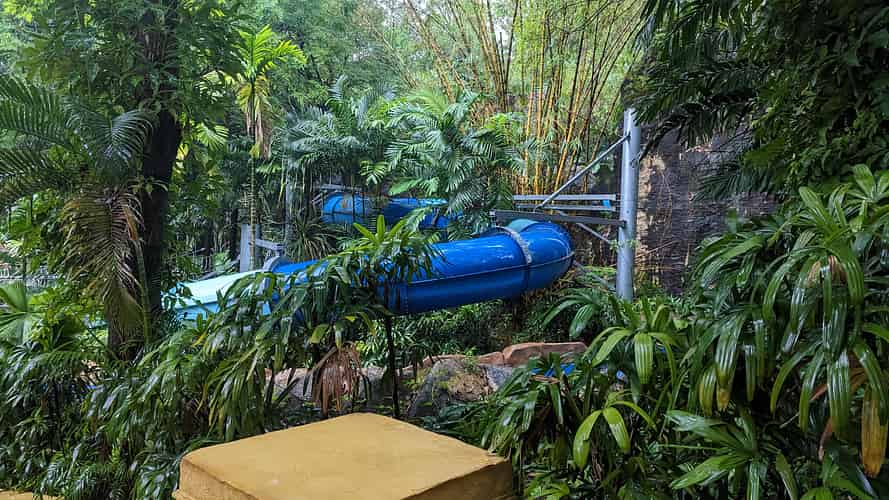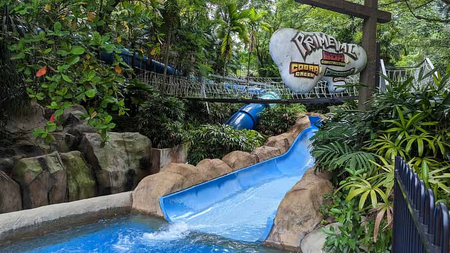 The Primeval slides wind through themed gorges in tropical gardens.