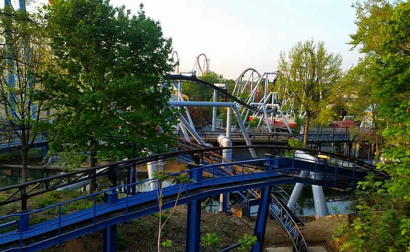 Great Bear (Like many coasters in the park) has a somewhat convoluted layout that ducks and weaves around terrain features and other rides, such as superdooperLooper.
