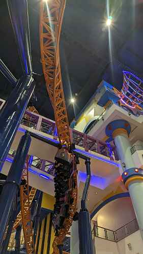 There are further turns as the track loops around to the lift hill. Check out those supports hanging off the building lifts.