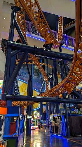 The roll is over a main walkway, providing an interesting vantage point of riders twisting above.