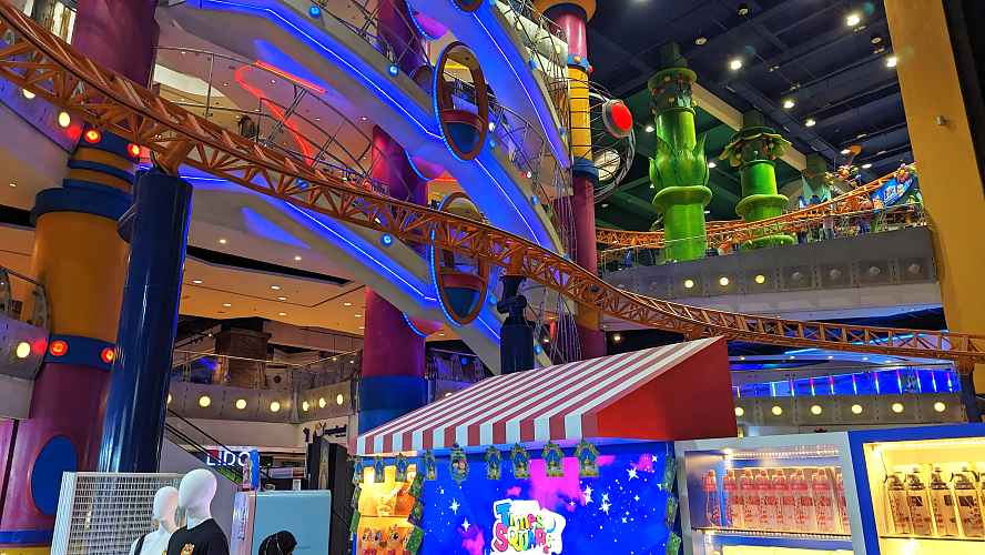 The ride weaves it's way around several other attractions, and passes through holes in several large pieces of theming.