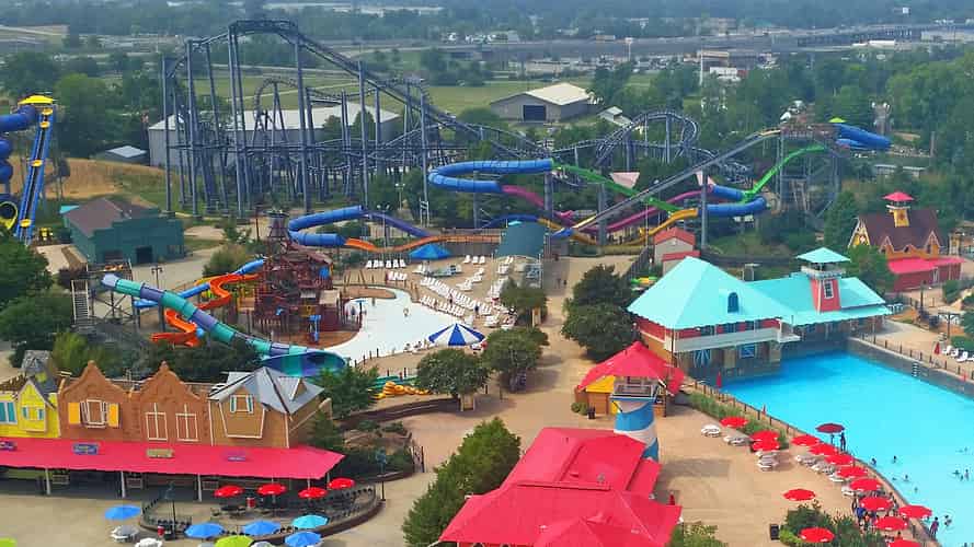 In the background is the T3 roller coaster, with the Deluge water Coaster in front of it. In the bottom left is the "Splash Zone", and the purple and blue "Mega Wedgie" bowl slide.