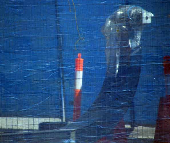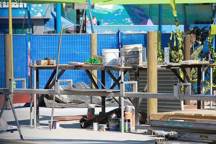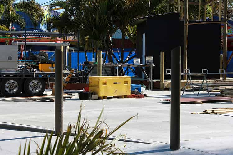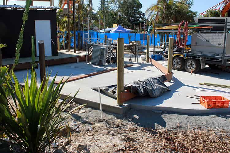 The mould for the central column's foundations has become a handy workbench while work focuses on concreting and theming.