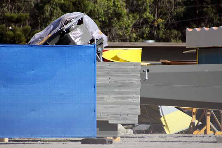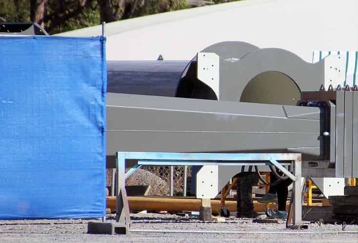 The 12 gondolas will attach here. Behind Tail Spin parts sits slide components for Triple Vortex, WhiteWater World's forthcoming Tornado 12 slide.