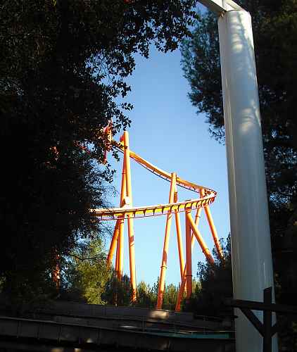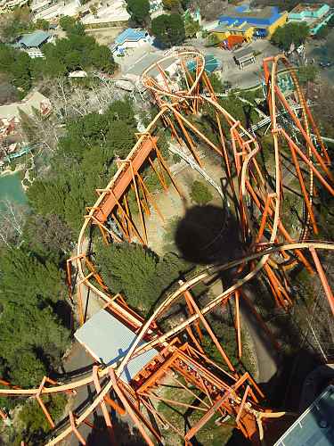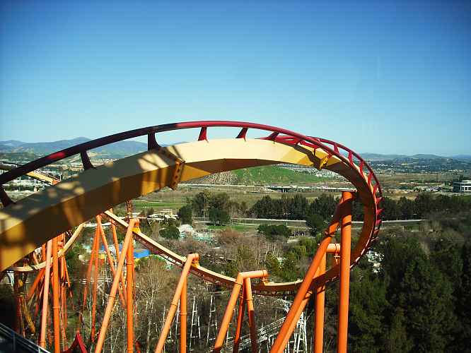 The worlds first steel coaster vertical loop, with Tatsu in the background.