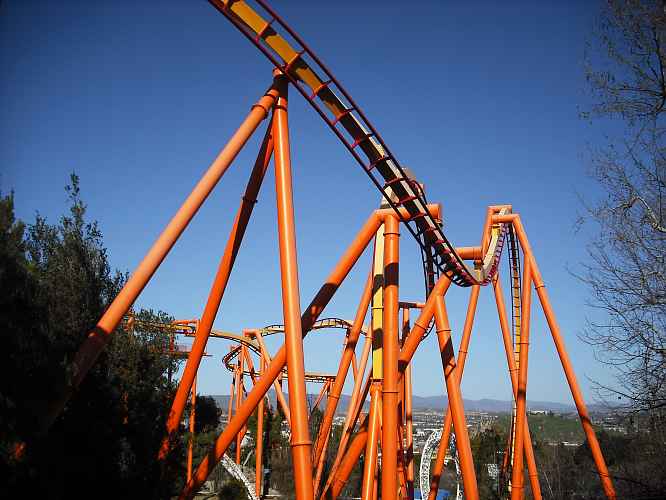 Here you can see one of Magic Mountains newest attractions soaring over one of its classics.