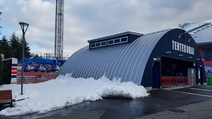 The tower for Tentekomai can be seen on the left. Fuji Airways is housed in the dome. The Takabisha roller coaster is behind. Food Stadium is the long building in front of Takabisha.