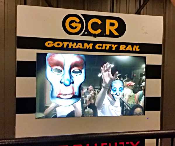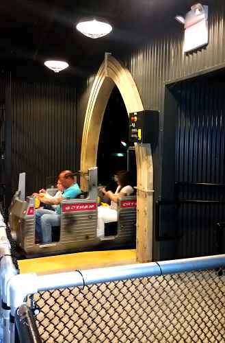 Groups of riders are admitted into a preshow room themed like the concourse of a Gotham City Rail station.