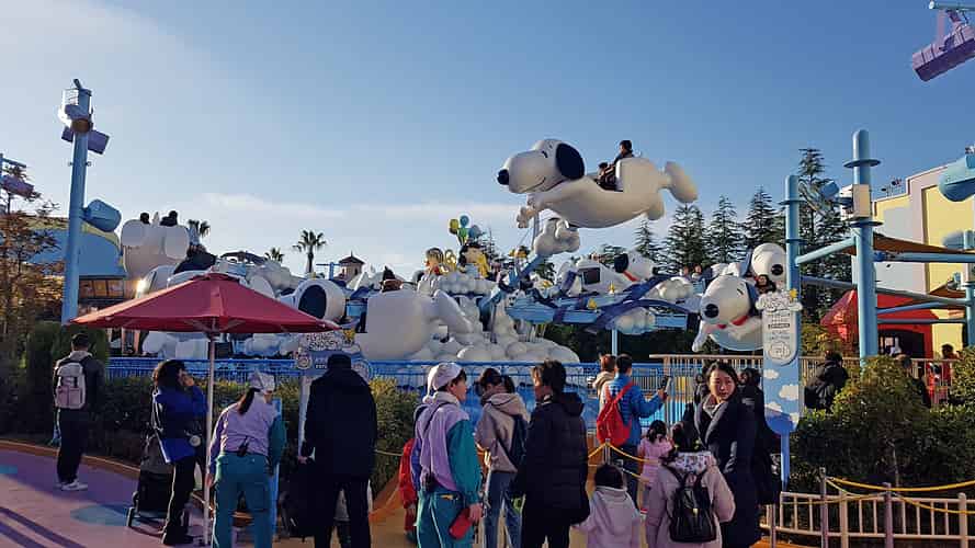 The Flying Snoopy is a Dumbo style ride with cars moving up and down as the ride spins.