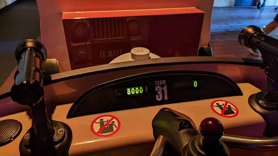 Guests ride in a continuous chain of jeeps equipped with laser guns.