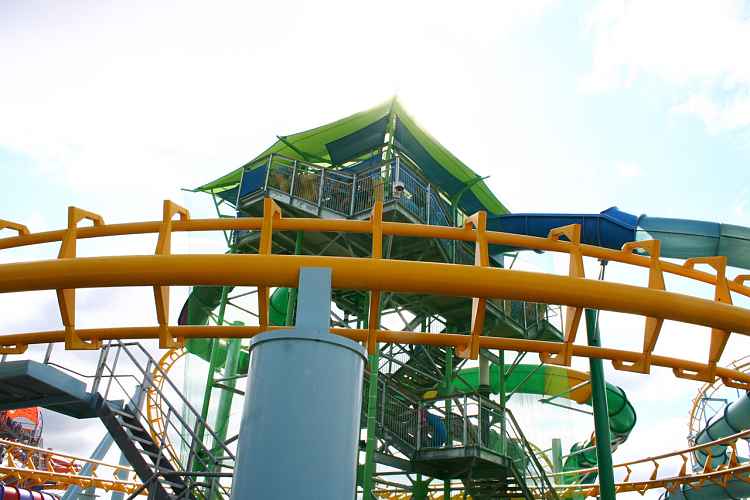 The tower is located within Cyclone's helix and each of the three slides wrap extensively around the coaster for some added thrills.