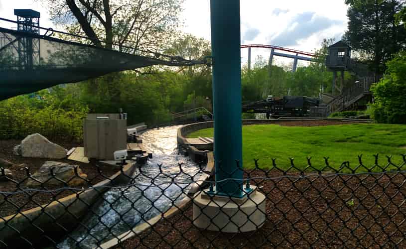 The flume uses the terrain, with the lift hill, and solitary drop running up and down the hillside respectively.