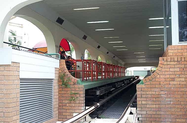 The top of the lift hill featured a unique plateau. This was Meisho's answer to the common problem of excessive wear on the train's chaindog caused by rapid acceleration while still attached to the lift hill's chain.